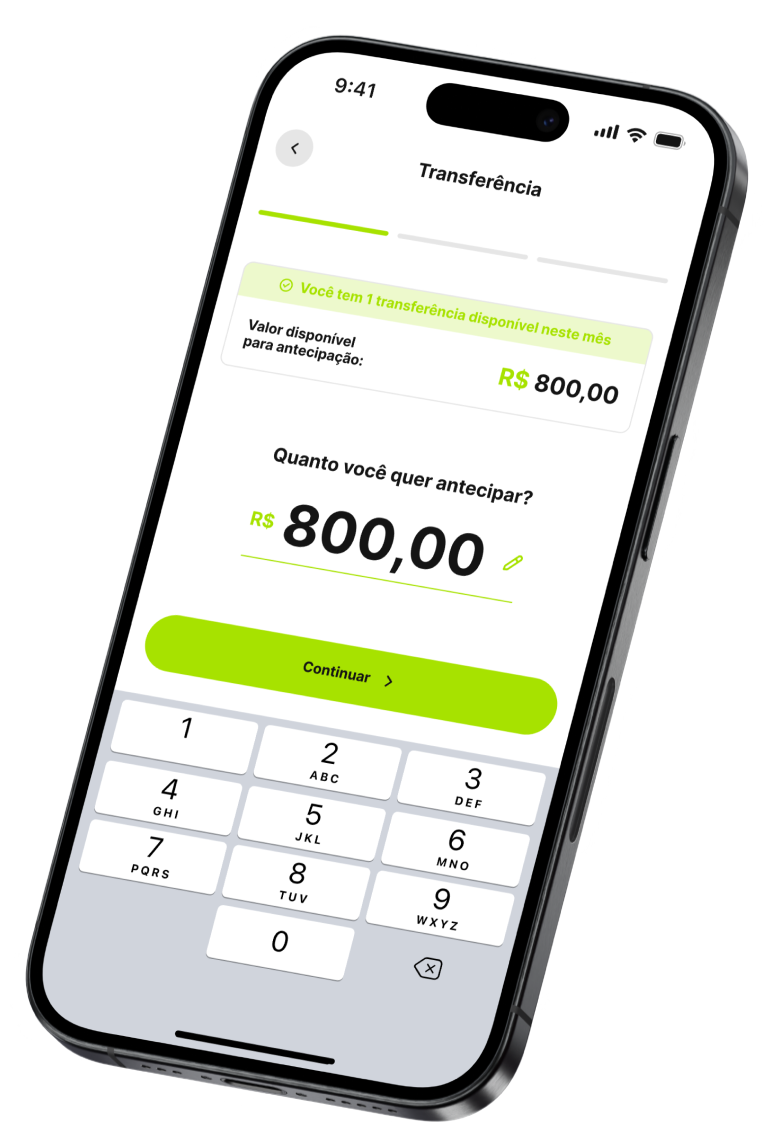 No app, você vê seu valor disponível, simula a antecipação com transparência e escolhe em quantas parcelas deseja pagar.